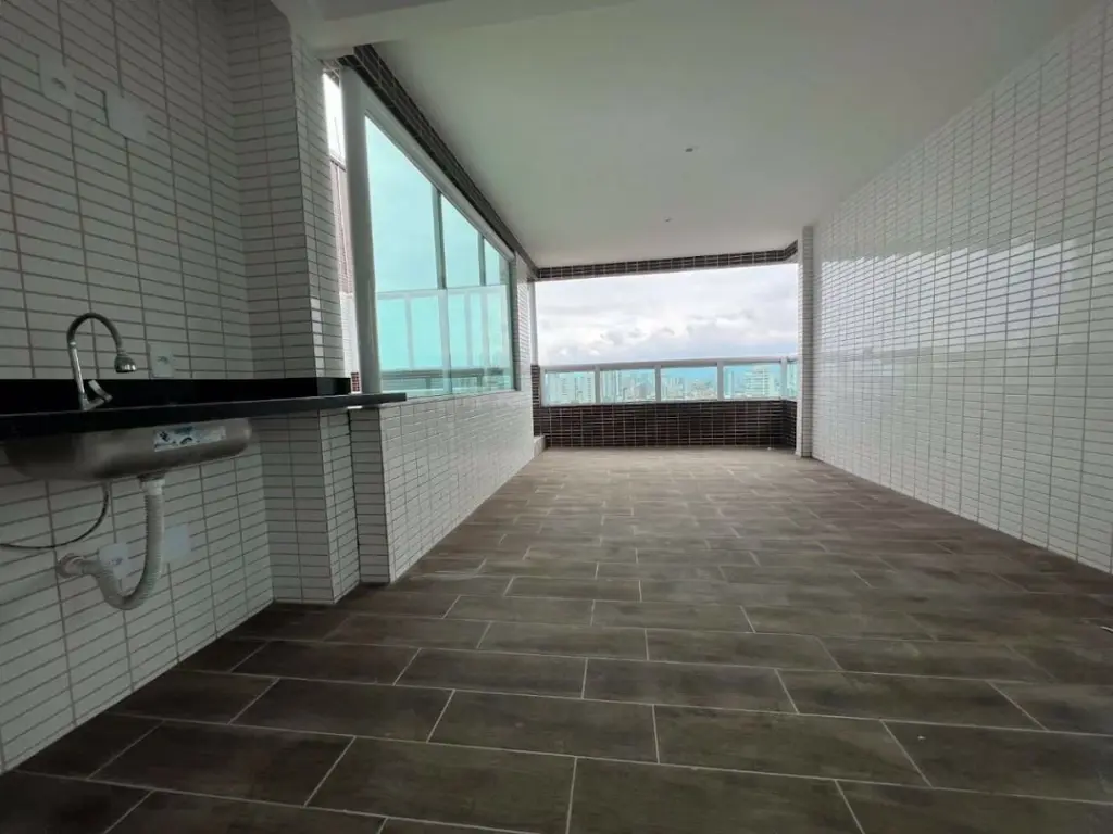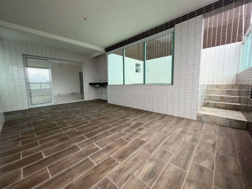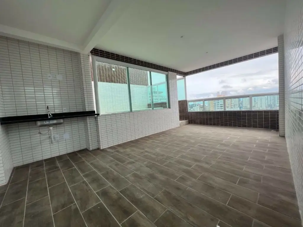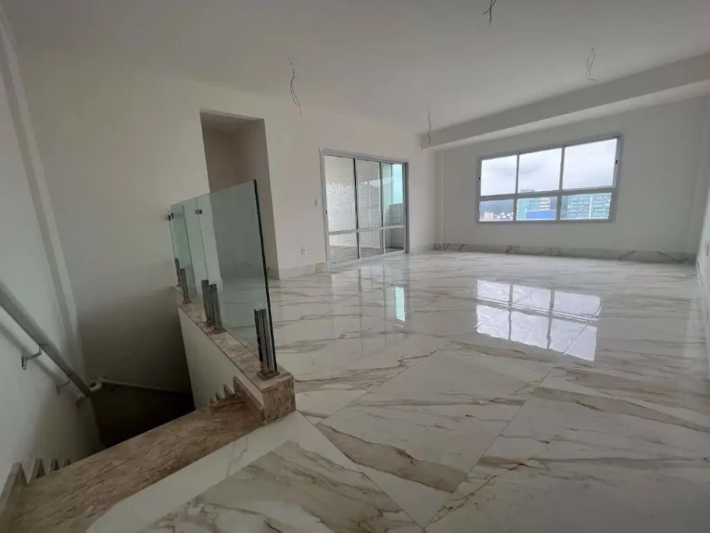 COBERTURA DUPLEX NO CANTO DO FORTE EM PRAIA GRANDE/SP - Com 166,26m² de área útil distribuídos em (piso superior) sala dois ambientes piso em porcelanato, varanda ampla com espaço gourmet e churrasqueira, jacuzzi, cozinha, lavabo, área de serviço, área técnica, escada com corrimão em vidro para o piso inferior ; (piso inferior) com 4 dormitórios sendo 3 suites com sacada e vista livre, entrada privativa e 3 vagas privativas.