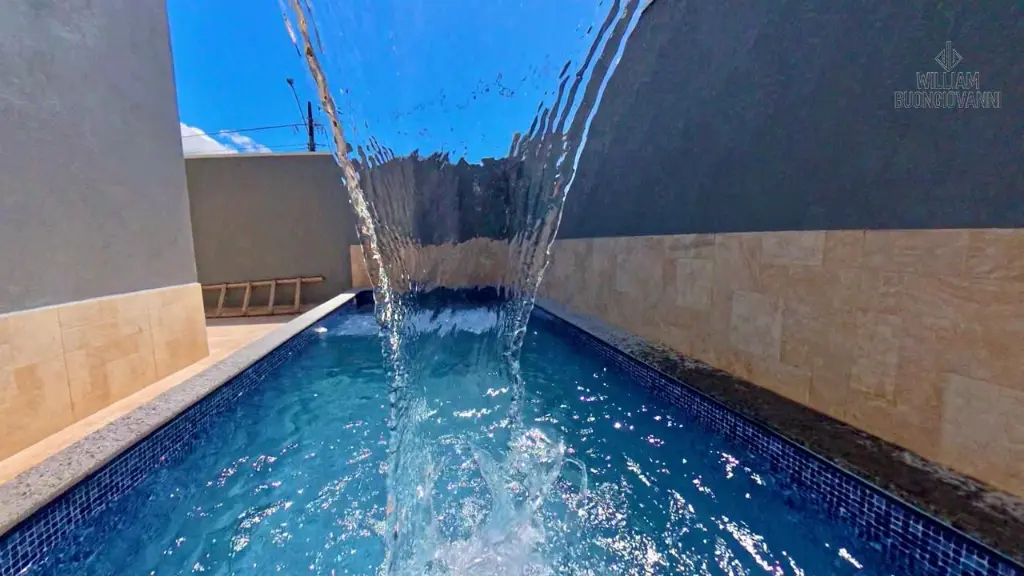 02 dormitórios (sendo 01 suíte)+ wc social, sala, cozinha, área de serviço, piscina, 05 vagas de garagem (sendo 01 coberta), portão de